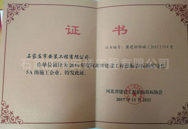 2016年度河北省建設(shè)工程招標(biāo)投標(biāo)誠實守信5A級施工企業(yè)
